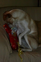 Aqui está ela, a abrir o seu embrulho. Sim, porque a minha Cookie teve direito a dois presentes: uma boneca e um osso com sabor a presunto! Delicioso...
